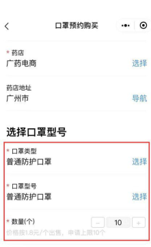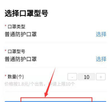 ⑦选择需要预约购买的口罩类型(N95、医用口罩、一般口罩)、购买数量(根据口罩类型选择5-10个);