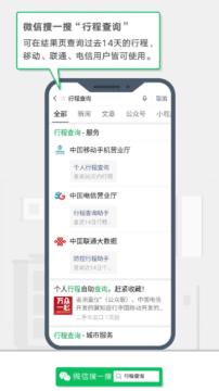 除了通过给三大运营商发送短信查询最近15天-30天内的行程外,现在,微信也上线了“行程查询”的服务。移动联通电信用户均可通过手机号查询过去14天的行程。