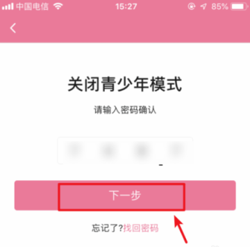 点击进入关闭界面,在页面中输入青少年模式的密码,点击下一步。