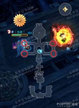 地图上有4个圈,这四个圈各自有一个小BOSS,BOSS身上都会有个BUFF,BUFF会显示对应的颜色,分别是:红,绿,橙,紫。四色,这4种颜色下图4个红圈的房间会变成这4中颜色,BOSS需要拉到这和自身BUFF颜色相同的房间内才会被玩家造成伤害从而击杀,不能让BOSS互相见面,见面了BOSS身上的BUFF会让BOSS狂暴。然后。。你懂的。