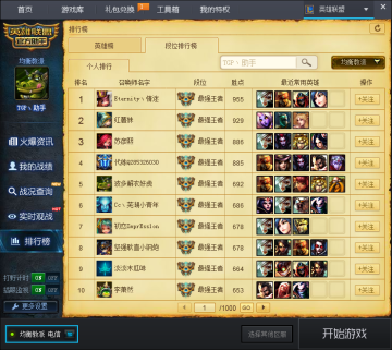通过点击面板左侧“英雄联盟入口”即可进入助手游戏外界面,可阅读最新资讯、观看游戏视频、查询战绩、实时观战大神对局以及查询国服权威榜单。