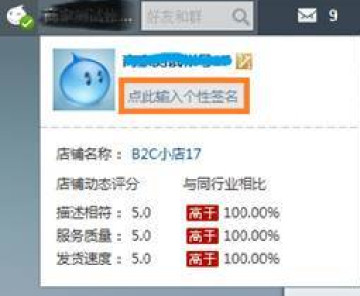 鼠标移动到账号名上,会自动显示个人名片,输入个性签名。