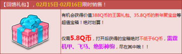 2.15-2.16,超值回馈礼包低价出售,仅需5.8Q币,价值388Q币的极品王国礼包等你来抢!超值优惠,各式极品道具均于礼包中低价大放送,赶紧来试试自己的新年手气吧!