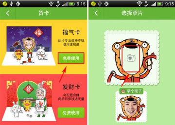 3、在进入贺卡界面,点击“免费使用”按键,在进入选择照片界面,按“拍摄”按键。