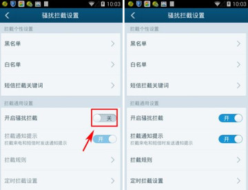 3、在进入防骚扰设置界面,点击开启骚扰拦截的开启按键即可。