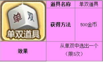 游戏起始,玩家可以通过购买页面进行购买道具,这时候的道具基本上都是消耗型道具,供玩家在游戏中使用。二单双道具则是一个非常好用的道具之一。单双道具主要用于在游戏中转换单双选择权利,而且每一个单双道具可以给玩家提供3次这样的机会,关键的时刻非常实用。推荐大家在游戏前够买一个。