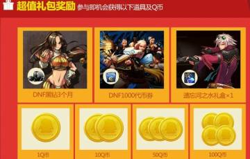 4、Q币奖品有100Q币、50Q币、10Q币、1Q币;DNF道具有:DNF1000代币券,遗忘河之水1个,领主神器袖珍罐1个,还有DNF黑钻3个月和12个月;