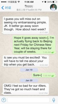 4.在聊天过程中,不会出现‘对方正在输入….'这句话,但是如果你的信息传送成功,会在信息方框右下角显示一个绿色小勾勾,如果对方’已读‘该信息,则会出现两个小勾勾(如下图)。另外,Whatsapp还会显示对方最后上线时间,这点微信是木有的。
