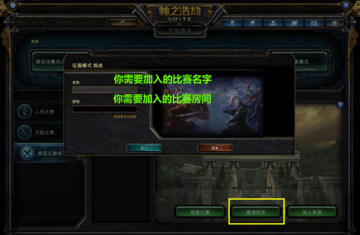 1、如果你是一个人加入一个自定义比赛,请点击加入单挑,并输入比赛名字和可能存在的密码,如果你创建了一个房间,系统并不默认你自动加入,您需要和小伙伴一样点击加入。