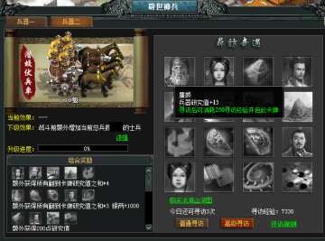 潜蛟伏兵车的升级方式与九转通天炮的升级方式相同,需要兵器研究值。通过寻访兵器卡牌可获得兵器升级的研究值。 注:潜蛟伏兵车和通天炮共用寻访次数,玩家可以选择兵器进行寻访。