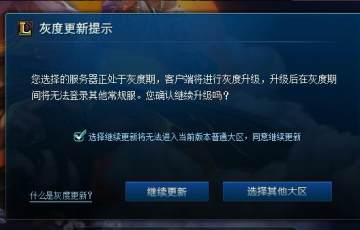 2、选择灰度区的“祖安”电信后,将会弹出灰度更新提示信息,如下图: