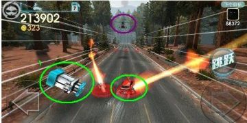 遇到直升机投放炸弹的时候,前方会有系列红点,玩家只需把这些红点当成汽车,躲过即可,完美闪避炸弹(跟惊险超车一样)一次会获得2000的积分。在躲避炸弹的同时注意拾取画面中出现的子弹,去攻击直升机。