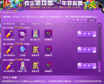 3月10日-3月12日,每日20:30-21:30,通过QQ游戏大厅登陆夜店之王,累计在线时间即可领取超值大礼。