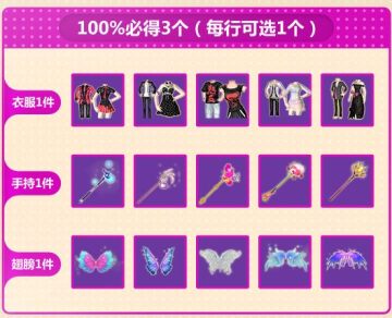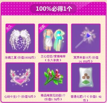 还可以获得包含奢华非卖兰心悠悠/爱情海岸、价值1800的飞行翅膀冰魄之翼等奖品在内的某一件奖品。