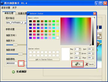 单击倒影颜色后面的颜色区块即可打开颜色设置窗口,在此选择要使用的倒影颜色,然后单击“OK”按钮即可。如图5所示。