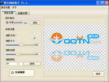 图片倒影助手还支持带有透明通道的图片,全面支持具有透明效果的图片。导入带通道的图片,在设置倒影颜色区当中单击“透明”按钮设置透明倒影效果,然后单击生成倒影按钮。如图8所示。