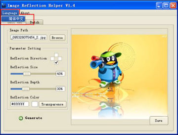 图片倒影助手支持英文界面显示,单击语言设置菜单选择“English”选项,当重新启动图片倒影助手时即可进入英文显示界面。如图10所示。