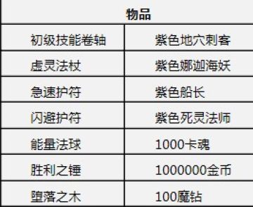 紫色绵羊、黄金女妖、随机碎片、技能书碎片、随机紫卡、随机蓝装、随机绿装、蓝装修复锤