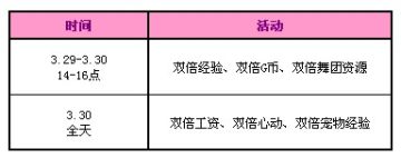 3月29日至3月30日每天14-16点将开启双倍经验、双倍G币、双倍舞团资源活动,3月30日全天还有双倍工资、双倍心动、双倍宠物经验活动。