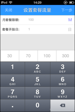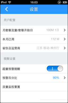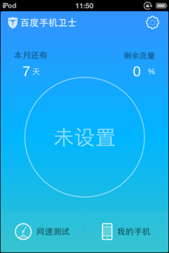 iOS版的百度手机卫士所提供的这项流量监控究竟效果如何呢?由于该功能是目前产品的主打项目,所以整个主界面的大部分区域都被它占去了,轻触中部的圆形区域即可设置手机流量的相关信息,包括月流量套餐的限额、套餐的开始日以及运营商信息等等。