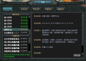 收集足量的子推饼后,登录游戏,在“任务”栏——“活动任务”——“清明礼包”中进行兑换。