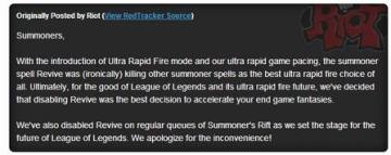 同时我们也决定在召唤师峡谷的常规匹配游戏里移除“重生”这个技能,为了更美好的未来。任何带来的不便我们深感抱歉。