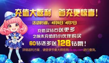 特别注明:首充返利获得的钻石小师妹将在4月14日前为大家发放到账户里哦,请大家届时注意查收!另外,第一次单次充值金额少于6元的小伙伴们再次充值就无法得到128钻石了哦!