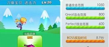天天酷跑满级进击力属性:普通攻击范围:1050;Great攻击范围:800;Perfect攻击范围:600;
