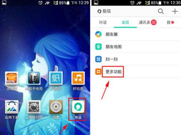 1、首先打开“易信”,然后在“发现”中点击“更多功能”。