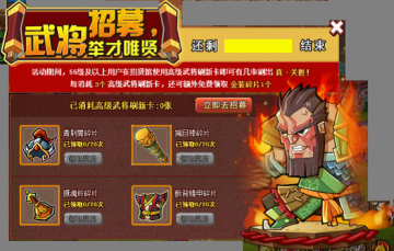 每消耗3个高级武将刷新卡,还可额外免费获得金装碎片1个,每个金装碎片限领20片。