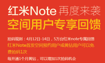 3. 红米note 手机空间首发活动的预约用户可以免费抢码1次,黄钻用户可以免费抢码1次,当用户两种身份重合时,抢码次数不累加,每个用户最多可以免费抢码1次。