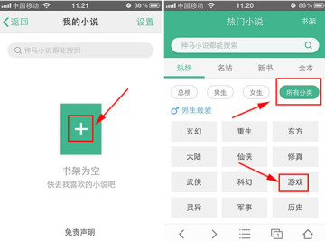 2、点击“+”添加键,然后进入小说页面,点击“所有分类”,再点击“游戏”;