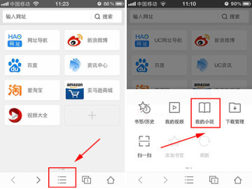 1、打开UC浏览器首页,点击屏幕下方中间的“三杠”,点击“我的小说”;