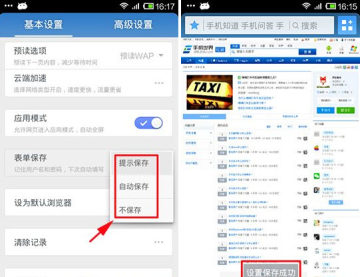 3、表单保存总有三种方案供选择,一是提示保存,二是自动保存,三是不保存。你可根据你实际的需要进行设置。退出到网址时即有设置保存成功的字样出现。