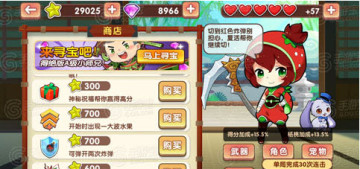 全民切水果游戏中除了有角色的加入以外,切水果中还有宠物系统,宠物能使游戏加分大幅提升,而且宠物可是有叠加的加成,拥有宠物越多,得分提升越高。在传统的《水果忍者》中我们可以进入道场更换刀刃,而《全民切水果》更是将刀刃变为了武器,武器可以提高连击得分和所有水果的得分。
