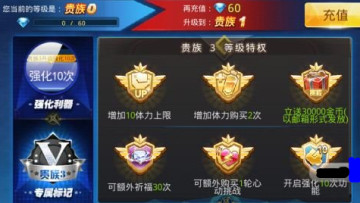 天天炫斗有贵族3等级,玩家们只需要充300钻石即可拥有,也就是话费30RMB,可以拥有增加5体力上限、增加体力购买2次等特权,下面是详细的内容介绍。