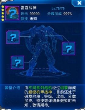 这是一架由不同系列战机组装而成的超级机甲战神!目前正处于研发阶段。可以预见的是之后推出的雷霆战神绝对是一个大杀器!当然3架不同系列的战机起码也是紫色系列才能合成!所以各位同学,为了机器人,存起你的紫色战机吧!