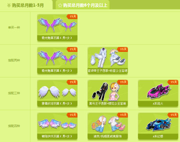6、玩家购买总月数为1-5个月,根据搭配类型赠送15天道具;购买总月数6个月及以上,根据搭配类型赠送30天道具。玩家可参照买赠奖励区的表格。