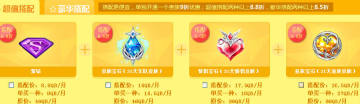 4、超值搭配内容包括紫钻贵族、贵族宝石(车队)、情侣宝石(情侣) 、皇权宝石(皇族),单买一种折扣为9折,搭配两种以上为8.8折。豪华搭配内容包括豪华紫钻、车队贵族、情侣贵族、皇族,单买一种为9折,搭配两种以上为8.5折。贵族宝石、情侣宝石、皇权宝石需要玩家在游戏中使用才能生效。