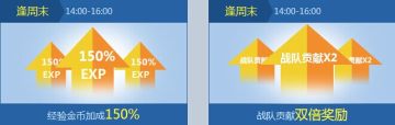 活动期间,逢周末14:00-16:00,全区150%经验、金币奖励开启!同时,战队任务将奖励双倍战队贡献,快快组团加入战斗吧!