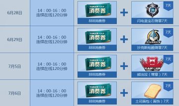 活动内容 活动期间,逢周末14:00-16:00连续在线120分钟可获得888消费券和商城热卖饰品7天等丰富奖励!本月累计赠送8880 消费券,丰富回馈,不容错过!