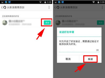 3、在这里可以看到你所有绑定了易信的微博好友,在要添加好友的人名称旁边点击【添加】,然后输入验证文字点击【发送】,等待朋友确认添加就行了。