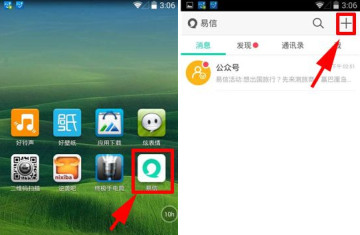 1、易信如何通过微博添加好友?首先打开易信,点击右上角【+】。