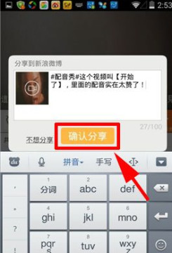 作者:qqtn冬冬 人气:0配音秀看到一段很有意思的视频,想要分享给微博的好朋友们,要怎么操作呢?下面是详细的教程介绍。