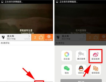 2、点击下排靠右的按钮,在弹出菜单选择【新浪微博】。(点击下排靠右的按钮,在弹出菜单选择【新浪微博】。