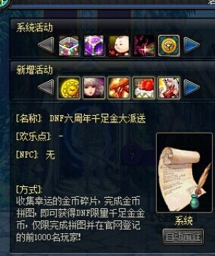 DNF六周年千足金大派送活动 收集幸运金币的碎片得限量千足金金币