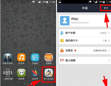 1、打开支付宝钱包,点击右下角【财富】,选择右上角【更多】。