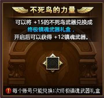 不死鸟的力量免费武器换镇魂获得期间,可以在冥炎鸟之气息处用+15强化等级的不死鸟武器兑换+12强化等级的镇魂武器。兑换成功后,可以获得【终极镇魂武器礼盒】一枚!