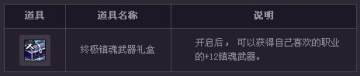 作者:qqtn冬冬 人气:0dnf终极镇魂武器礼盒开启后可以获得自己喜欢的职业的+12镇魂武器,每天只能兑换获得一个哦,下面是详细的内容介绍。