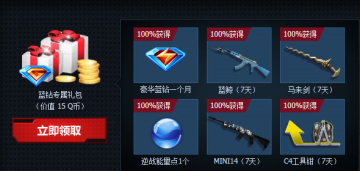 花费15QB可获得一个月豪华蓝钻+1个逆战能量点+四种道具